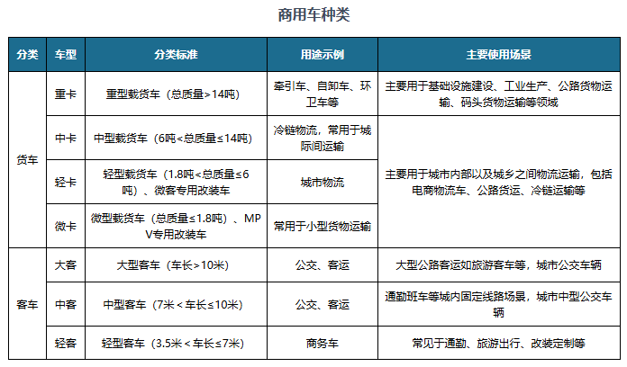 商用车做为出产材料,办事于公客运和道货运等场景,用于运送人员和货色。相较于乘用车,商用车运营属性更强,取公客运量、货运量关系慎密,也取宏不雅经济的成长亲近相关。商用车可划分为货车和客车两类。按照总质量等车型参数,货车可分为沉卡、中卡、轻卡和微卡;按照车长等车型参数,客车可分为大客、中客和轻客等。