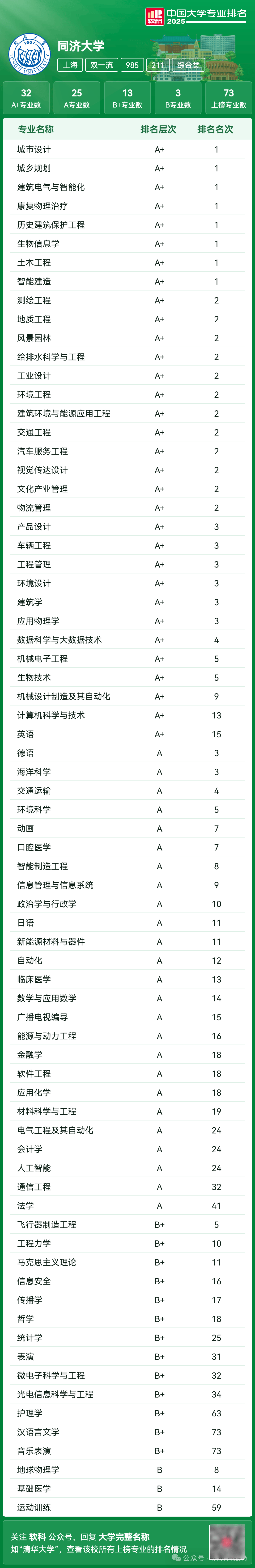 正在“2025软科中国大学专业排名”中,同济大学共有73个专业上榜,此中A+专业数32个、A专业数25个,B+专业数13个、B专业数3个。