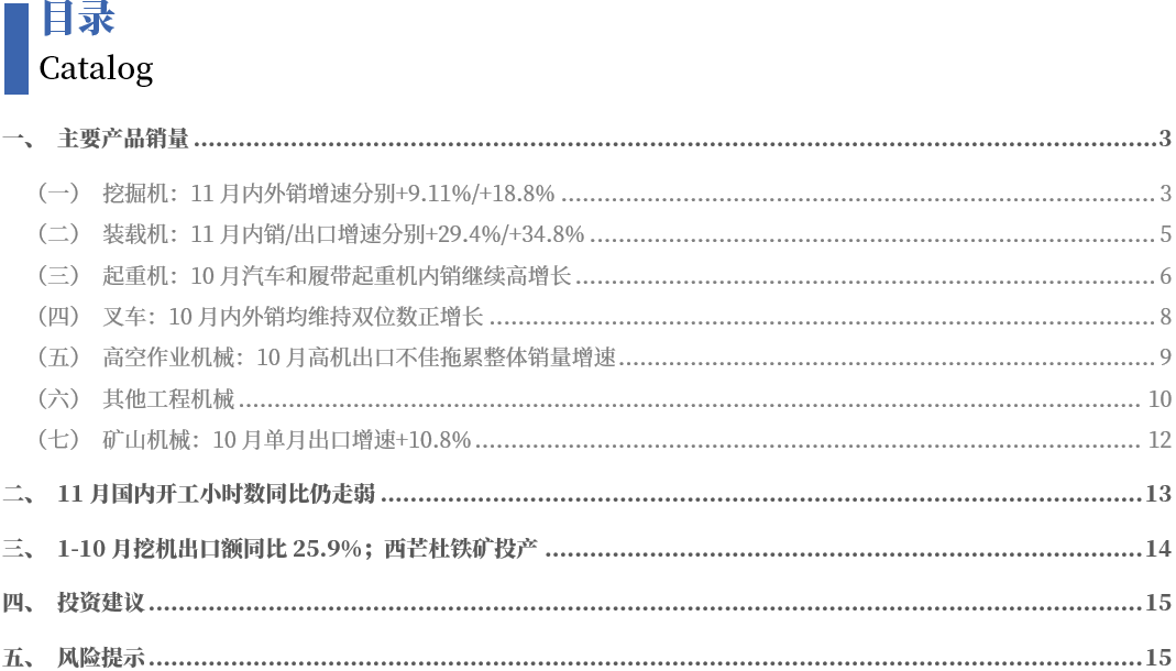 :11月发卖各类挖掘机20027台,同比增加13。9%。此中国内销量9842台,同比增加9。11%;出口量10185台,同比增加18。8%。(2):11月发卖各类拆载机11419台,同比增加32。1%。同比增加29。4%;出口量5748台,同比增加34。8%。11月电动化率25。7%,环比+0。34pct,1-11月累计电动化率约23。35%,环比1-10月添加0。26pct。其他产物:10月汽车和履带起沉机内销继续高增加;叉车表里销均维持双位数正增加;起落工做平台出口欠安拖累全体销量增速。协会数据显示10月销量增速:汽车起沉机全体+15%%/内销+41。7%/出口-4。47%;履带式起沉机全体+71。4%/内销+54%/出口+79。7%;随车起沉机全体+10。2%/内销+2。4%/出口+59。2%;塔机全体-6。8%/内销-16。7%/出口+14%;叉车全体+15。9%/内销+16。2%/出口+15。4%;起落工做平台全体-38。8%/内销-41。8%/出口-36。3%。11月国内开工小时数同比仍走弱;10月小松海外开工小时数:和印尼同比下滑,欧洲和日本同比回暖。协会数据,11月工程机械次要产物月平均工做时长为84。2小时,同比下降13%,环比增加4。08%;次要产物月开工率为56。5%,同比下降12。1个百分点,环比增加1。5个百分点。据小松官网,2025年10月、欧洲、日本、印尼小松挖掘机开工小时数别离为72。9h、80。9h、48。2h、219。3h,同比增速别离-2。9%、+2。1%、+4。5%、-0。3%。1-10月挖机出口额同比25。9%;世界级铁矿西芒杜铁矿投产。1)1-10月我国挖掘机出口总额85。2亿美元,同比增加25。9%。比利时、菲律宾、马里市场当月同比下降,印尼、俄罗斯、几内亚市场累计、当月增加,其罗斯当月增幅达三位数,沙特、巴西市场累计、当月均同比下降。2)世界级铁矿西芒杜铁矿投产。全面投产后,铁矿年出口量最高可达1。2亿吨。估计可年产1000台挖掘机。我们认为,11月挖机表里销增速较10月环比均增加,行业表里需共振向上态势明白。10月风电水电驱动的非挖板块苏醒态势持续;海外,一方面,欧美需求有所恢复,澳非拉矿山机械需求连结强劲,另一方面,24年国内品牌出口量占全球(不含中国)需求比例为19。2%,我们看好中国工程机械行业继续连结表里销向上的优良态势。宏不雅经济不及预期的风险,政策推历程度不及预期的风险,行业合作加剧的风险,出口商业争端的风险,汇率波动的风险。